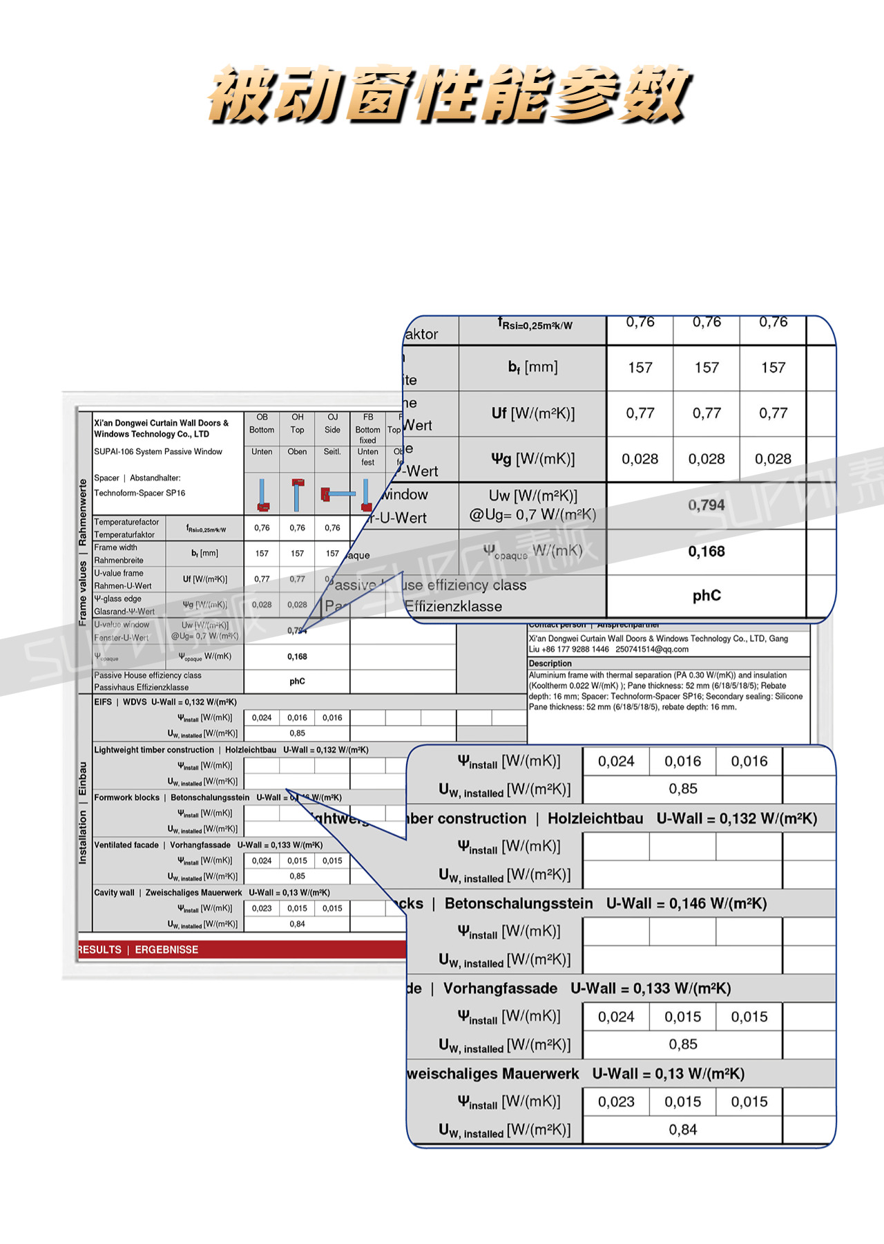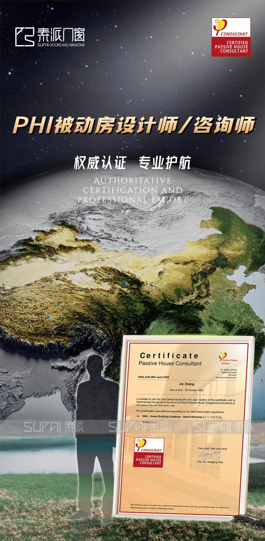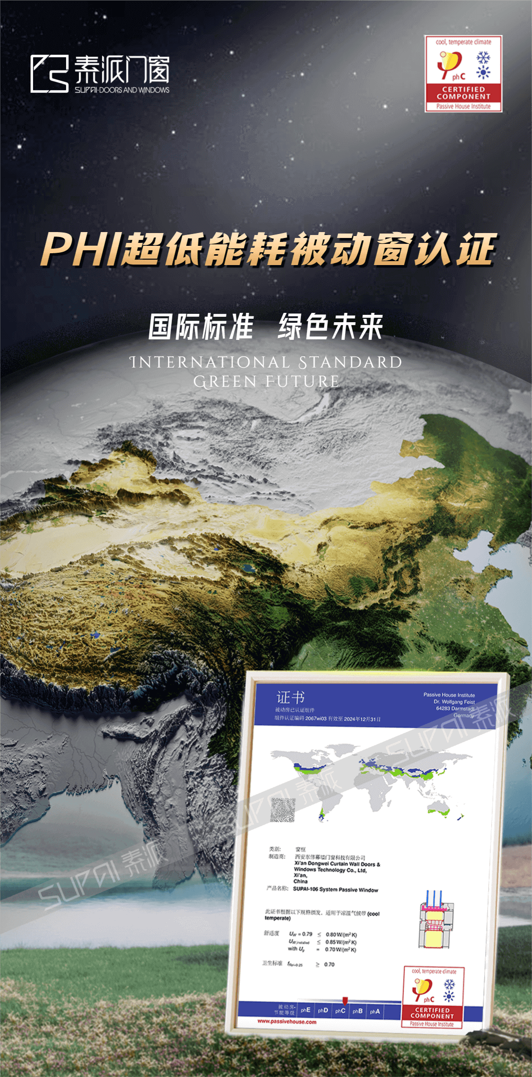素派门窗研发的106寰宇系列被动窗经德国被动式房屋研究所权威检测和评估,整窗保温隔热系数完全满足德国被动式房屋用窗的标准(即U值低于0.8w/(㎡·K),满足我国多个气候区的被动式超低能耗建筑需求。德国被动式房屋使用(PHI)认证,表明了素派门窗在超低能耗门窗研发领域技术实力的先进性。